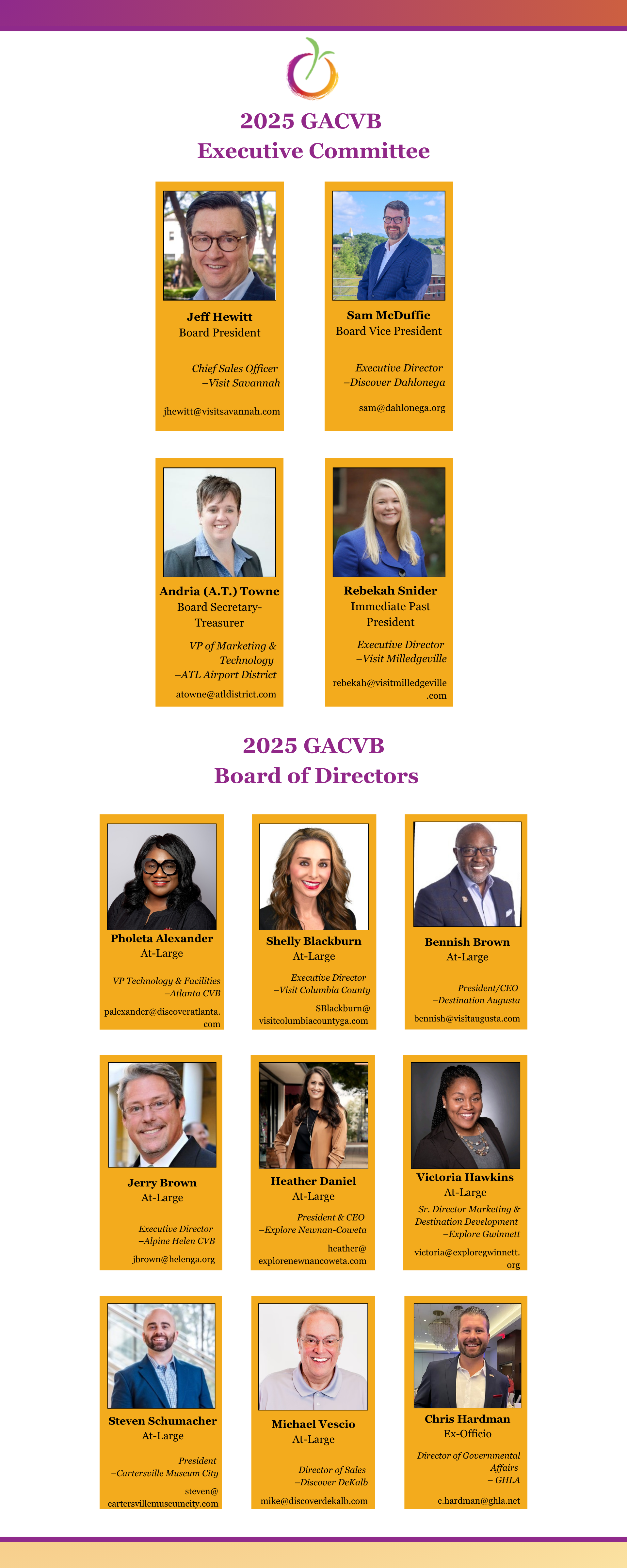 GACVB could not accomplish our goals without the help of our committees! Our members volunteer to serve on these committees, and are able to contribute by using their own skills, gifts, and expertise. We are always looking for volunteers! If you see a committee that interests you, feel free to reach out to the chair listed, or email us at [email protected] and we will be happy to connect you! |